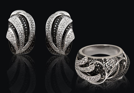 Белое золото (585), черные и белые бриллианты.