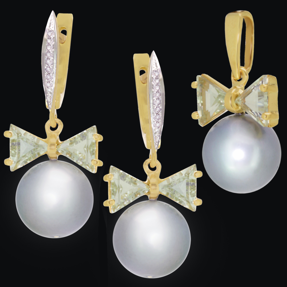 Золото(585), жемчуг, празиолиты, бриллианты.