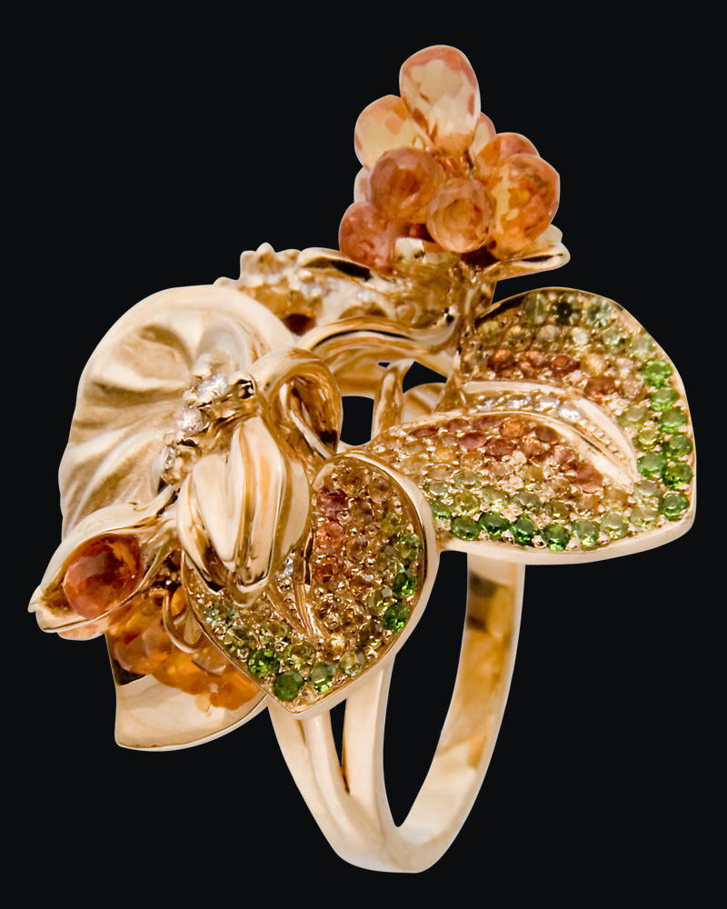 Золото европейское или белое (585), цветные сапфиры, бриллианты.