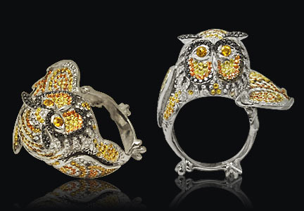 Белое золото (585), черные и белые бриллианты, рубины, сапфиры.