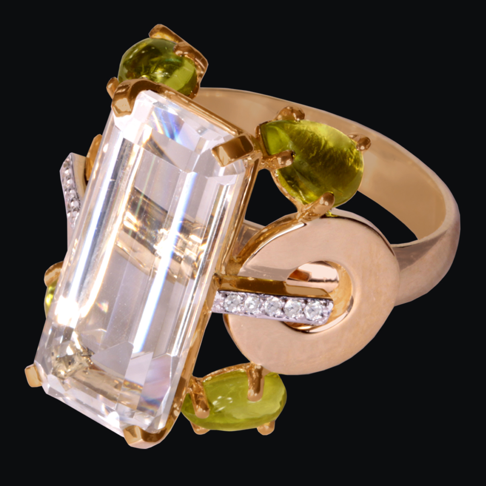 Золото(585), горный хрусталь, хризолиты, бриллианты.