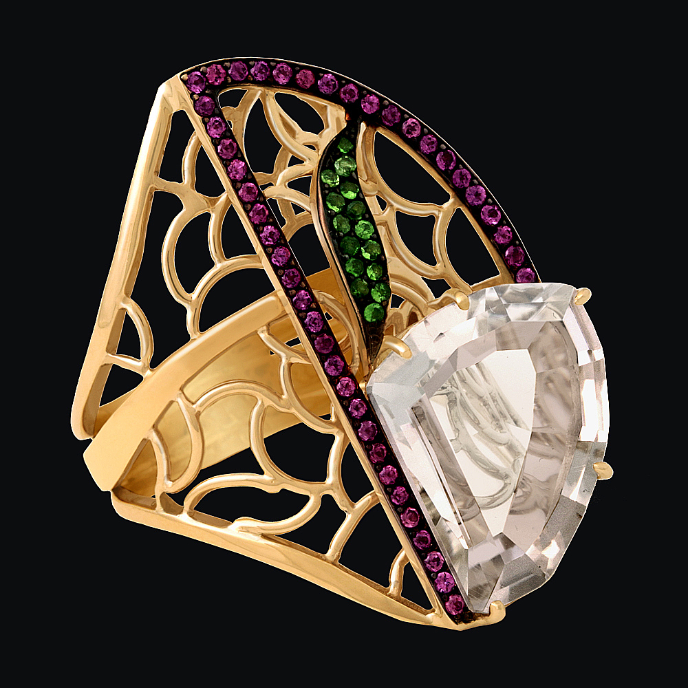 Золото(585), горный хрусталь, родолиты, тсавориты.