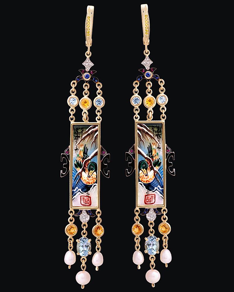 Золото(585), перламутр, топазы, цитрины, сапфиры, бриллианты, жемчуг.