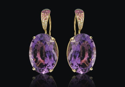 Желтое золото (585), аметисты, сапфиры. Вариант: белое золото (585), топазы, сапфиры.