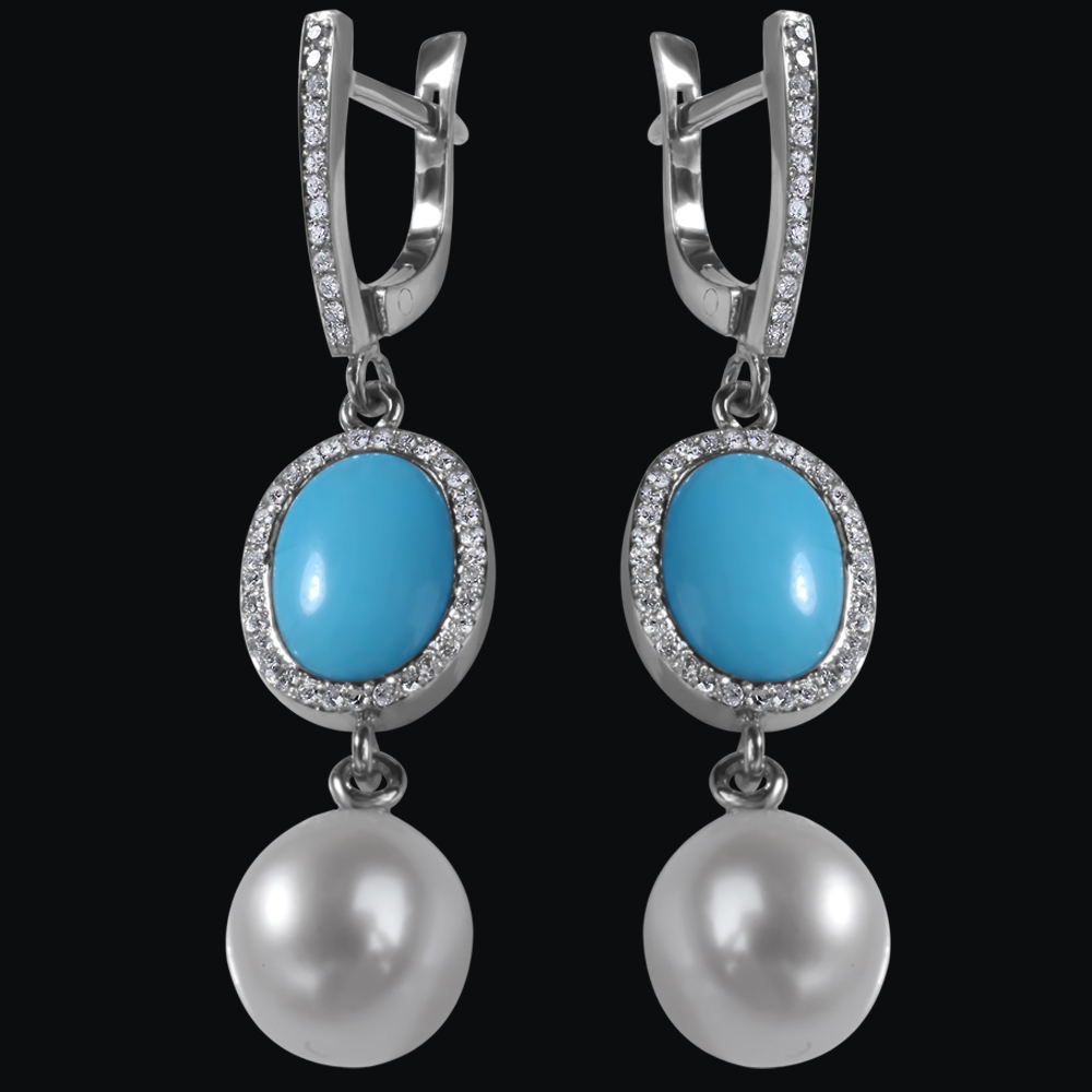 Белое золото (585), бирюза, жемчуг, бриллианты.
